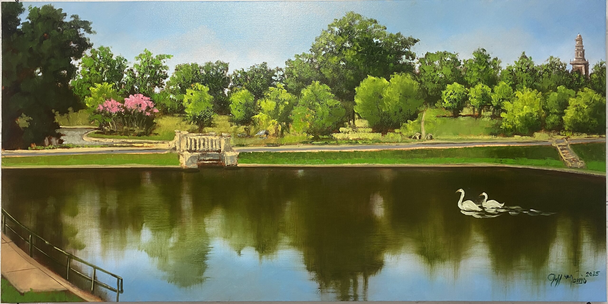 This original oil on canvas measures 24″x48″ and comes unframed ready to hang! Jeff Morris is a painter working in Richmond, VA. His large-scale landscapes capture the local beauty of historic sites in Richmond and beyond.