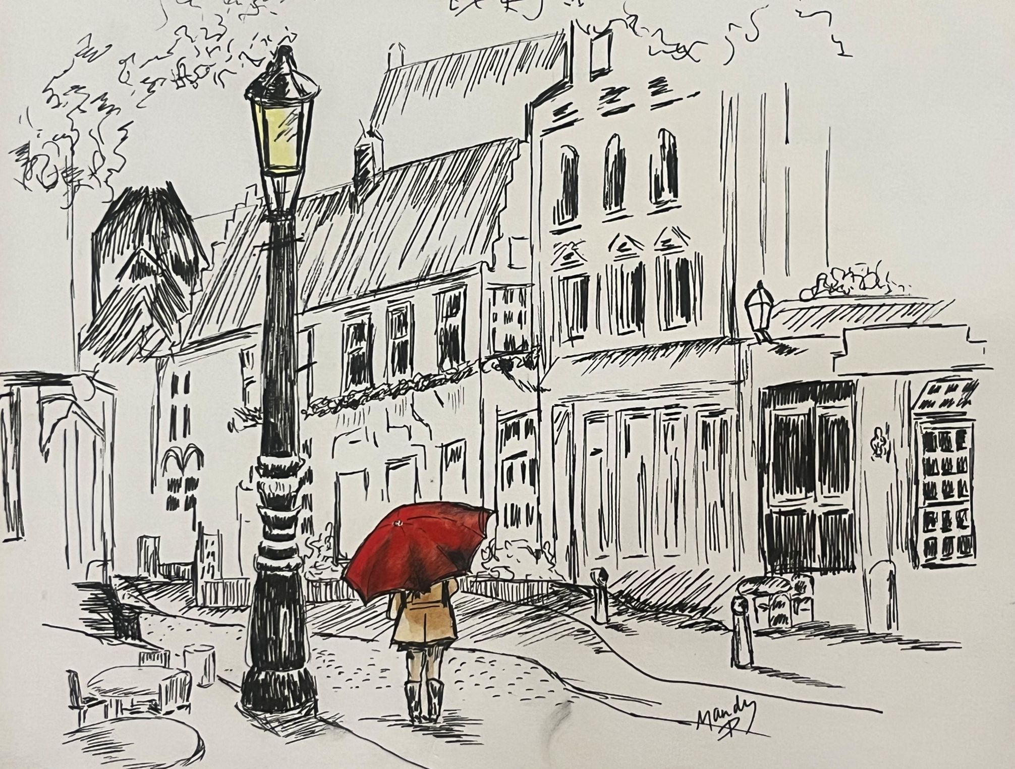 This original watercolor and ink measures 13×16″ and comes in a gold frame ready to hang. Mandy Powell, a mixed media artist from Richmond, Virginia, holds degrees in Literature, Art, and Early Childhood Education from VCU. She pursued her passion for art while teaching for 23 years, completing murals in Richmond and immersing herself in the fine arts community. Inspired by her experiences in Germany, she continues to create diverse art. Now in Manassas, Virginia, she participates in the local art scene as a member of the Prince William Art Society.