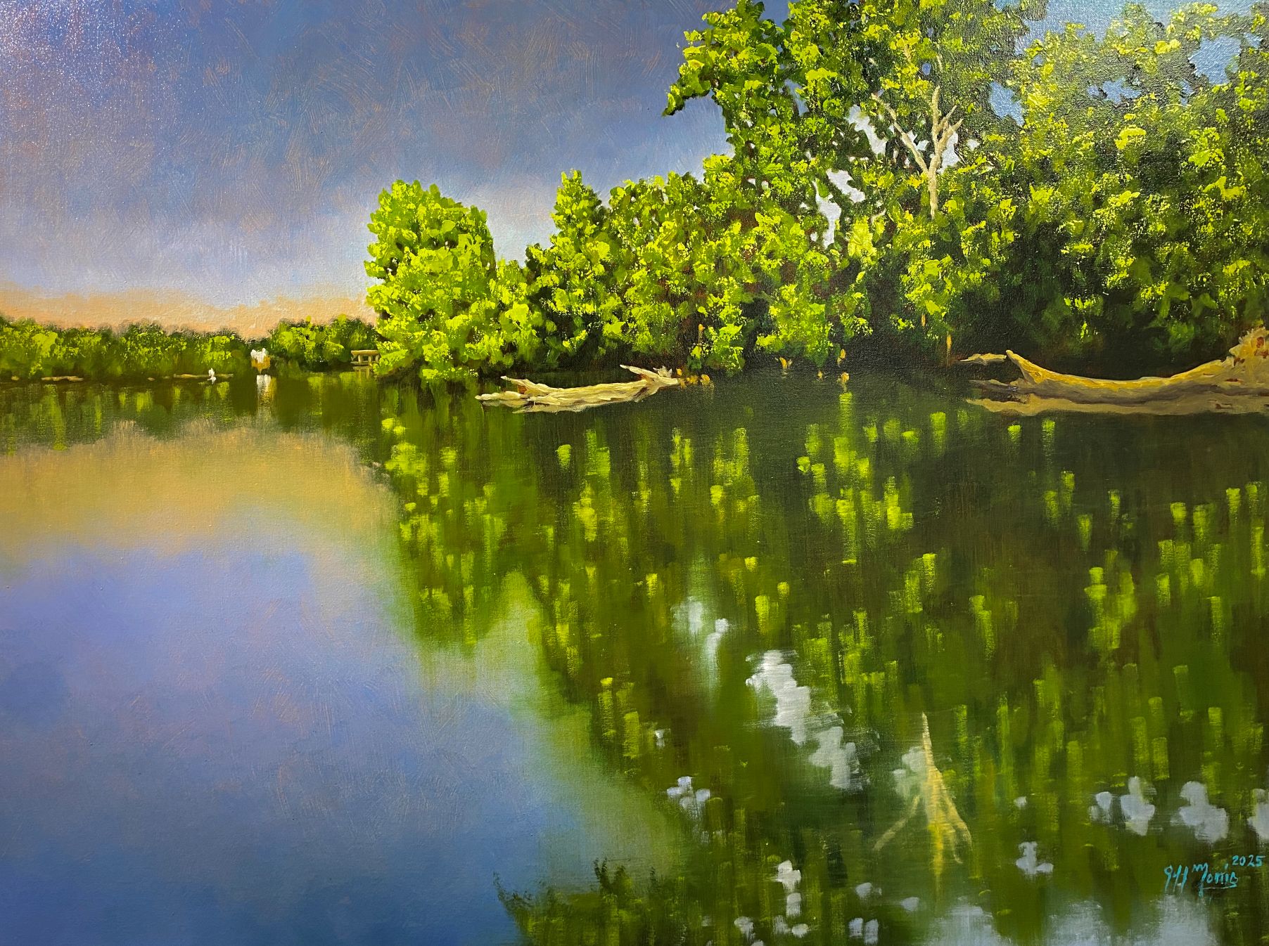 This original oil on canvas measures 36×48″ and comes unframed ready to hang. Jeff Morris is a painter working in Richmond, VA. His large-scale landscapes capture the local beauty of historic sites in Richmond and beyond.